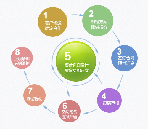 網(wǎng)站建設(shè)流程概述:客戶溝通,確定合作意向→制定建設(shè)方案,提供報價→簽訂合同,預(yù)付定金→初稿審核→前臺頁面設(shè)計,后臺程序開發(fā)→空間及域名選擇、開通→測試驗(yàn)收→上線培訓(xùn),后期維護(hù)
