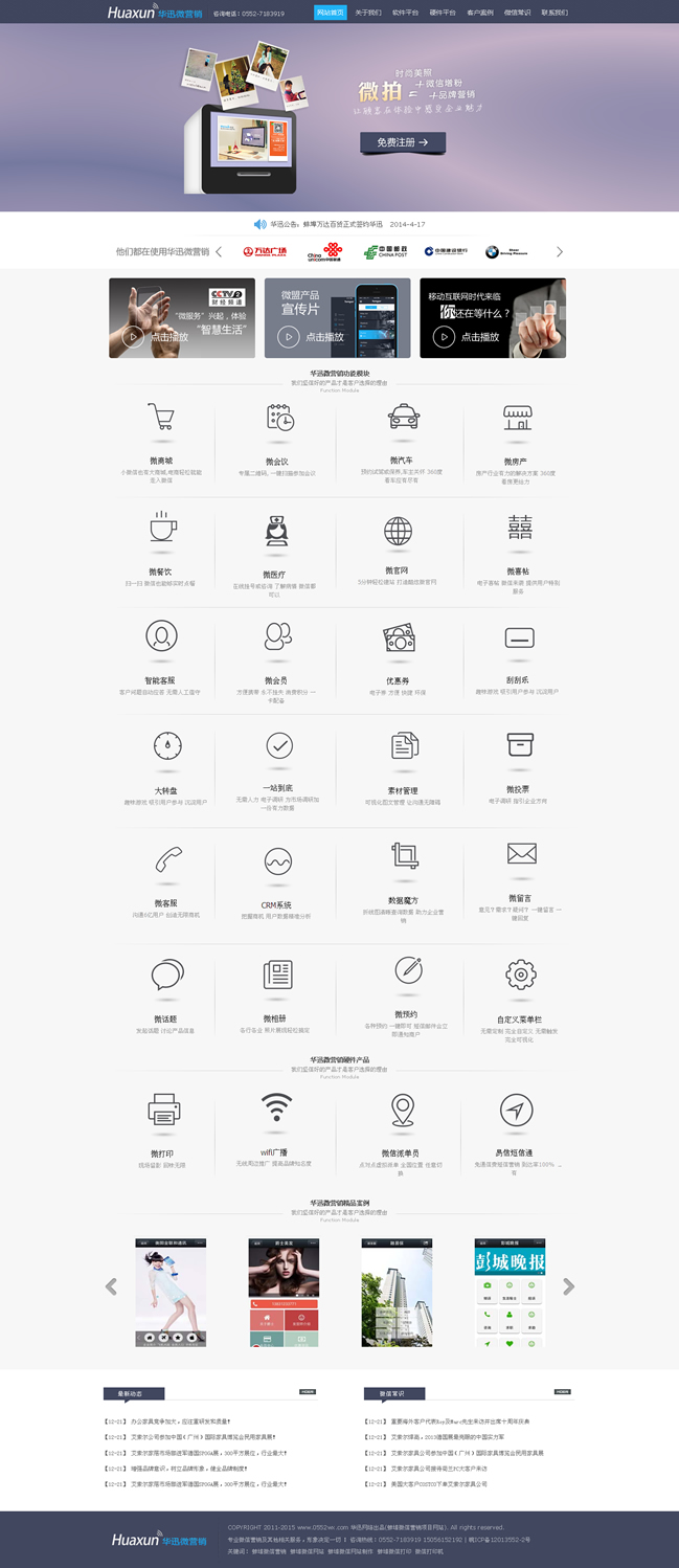 華迅網(wǎng)絡(luò)是打造一個(gè)專門針對(duì)微信公眾賬號(hào)提供營(yíng)銷推廣服務(wù)的第三方平臺(tái)。主要功能是針對(duì)微信商家公眾號(hào)提供與眾不同的、有針對(duì)性的營(yíng)銷推廣服務(wù)。通過(guò)華訊微網(wǎng)站平臺(tái),用戶可以輕松管理自己的微信各類信息,對(duì)微信公眾賬號(hào)進(jìn)行維護(hù)、開(kāi)展智能機(jī)器人、在線發(fā)優(yōu)惠劵、抽獎(jiǎng)、刮獎(jiǎng)、派發(fā)會(huì)員卡、打造微官網(wǎng)、開(kāi)啟微團(tuán)購(gòu)等多種活動(dòng),對(duì)微信營(yíng)銷實(shí)現(xiàn)有效監(jiān)控,極大擴(kuò)展?jié)撛诳蛻羧汉蛯?shí)現(xiàn)企業(yè)的運(yùn)營(yíng)目標(biāo)。華迅微網(wǎng)站平臺(tái)很好的彌補(bǔ)了微信公眾平臺(tái)本身功能不足、針對(duì)性不強(qiáng)、交互不便利的問(wèn)題,為商家公眾賬號(hào)提供更為貼心的、且是核心需求的功能和服務(wù)。在線優(yōu)惠劵、轉(zhuǎn)盤抽獎(jiǎng)、微信會(huì)員卡等推廣服務(wù)更是讓微信成為商家推廣的利器。智能客服的可調(diào)教功能讓用戶真正從微信繁瑣的日常客服工作中解脫出來(lái),真正成為商家便利的新?tīng)I(yíng)銷渠道。